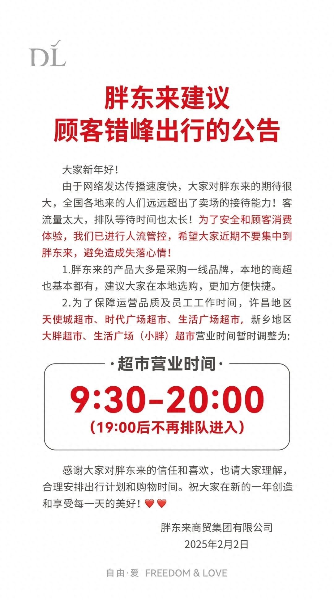 2月2日,正月初五,胖东来所有门店恢复正常营业。因顾客人数众多,胖东来商贸集团发布公告,建议顾客错峰出行。
