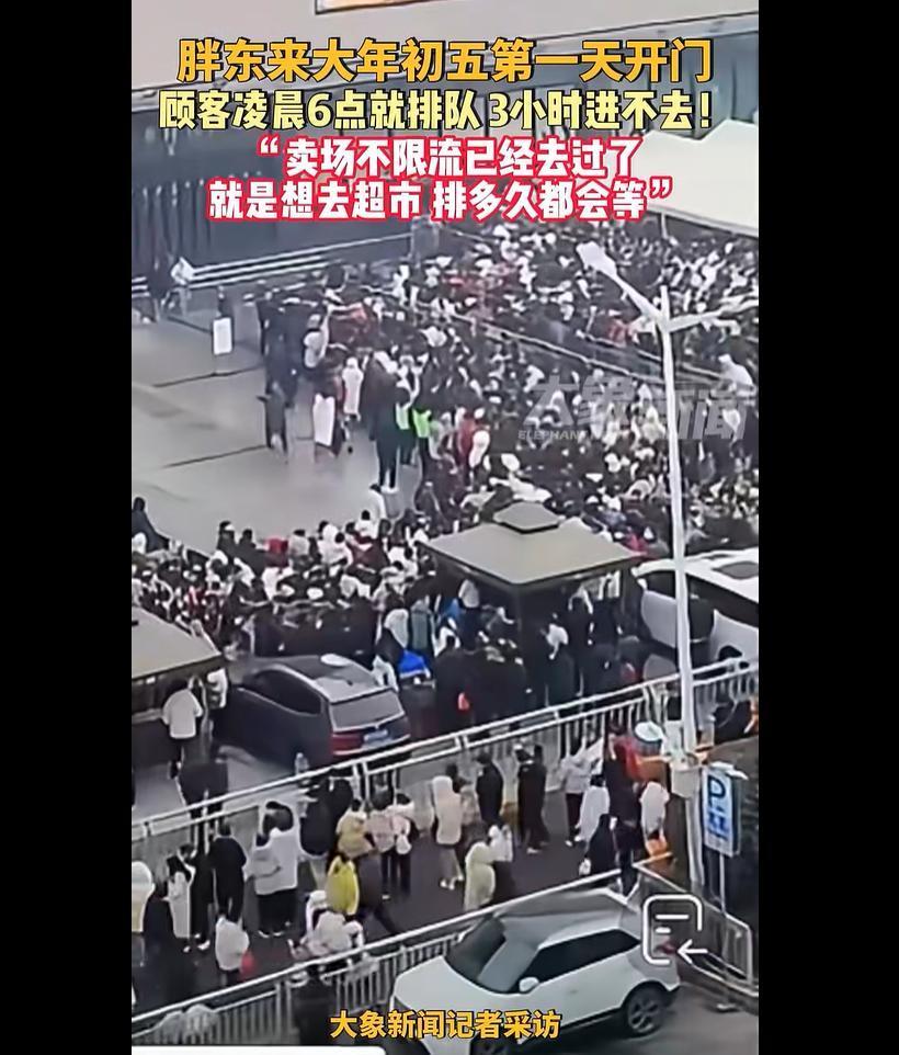 据报道,2月2日,胖东来大年初五第一天开门,顾客凌晨6点就排队,3小时进不去!有顾客接受采访时表示“卖场不限流已经去过了,就是想去超市,排多久都会等。”