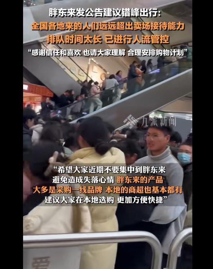 公告称,“全国各地来的人们远远超出了卖场的接待能力!客流量太大,排队等待时间也太长!为了安全和顾客消费体验,胖东来已进行人流管控,希望大家近期不要集中到胖东来,避免造成失落心情!”